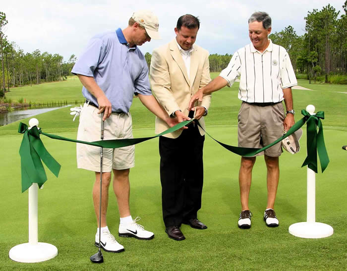 Ribbon Cutting at The Reserve at St. James Plantation. L - Michael Nicklaus, leader of Nicklaus Design team C - Jay Atkinson, President of St. James Properties, LLC R - Henry Ulrichs, Member and Chairman of the Club's Advisory Committee |
